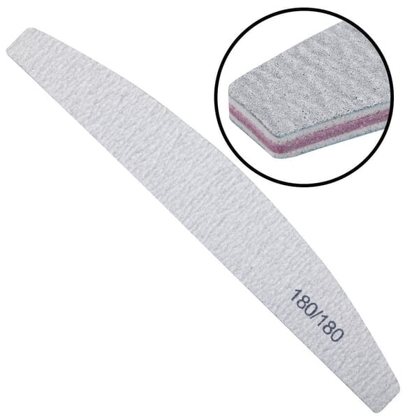 En universel engangsneglefil i bådform med 180/180 korn til naturlige og forlængede negle med ekstremt holdbare komponenter og lang levetid.
