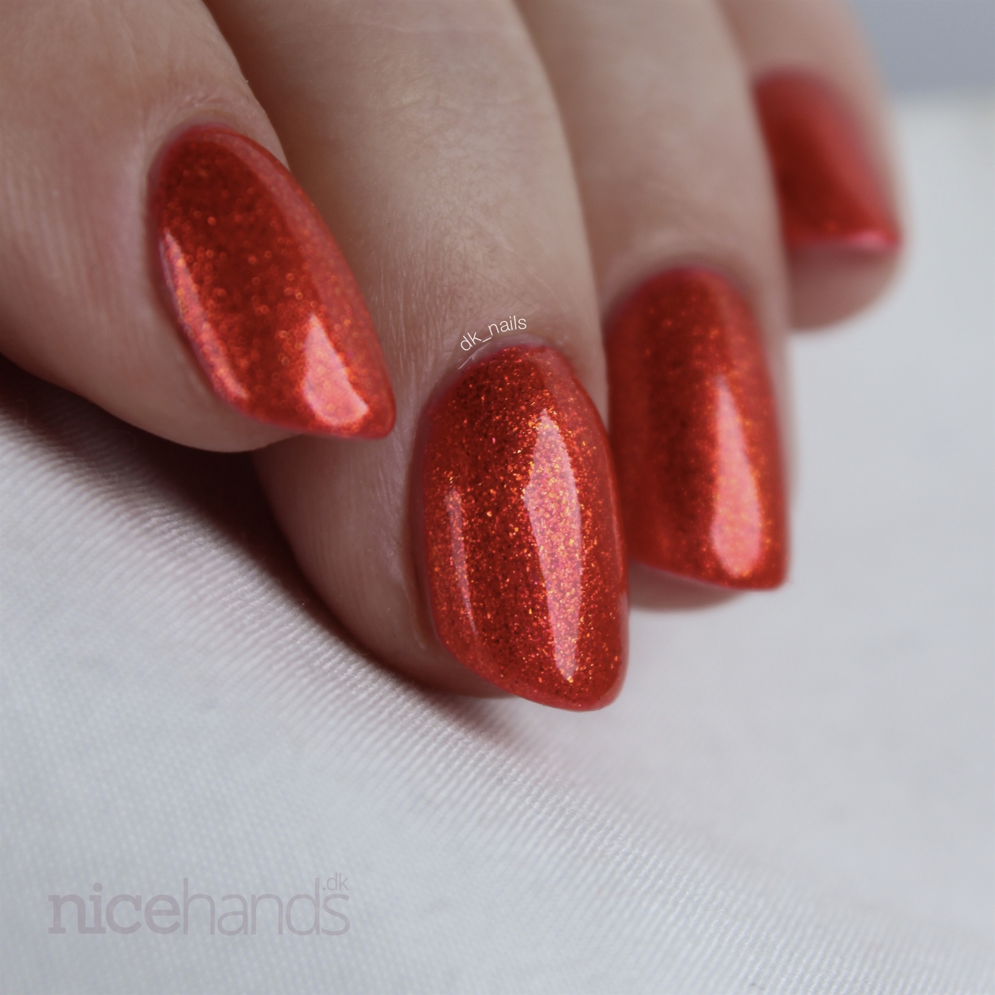 Carole er en flot rød neglelak med en smuk gylden shimmer. Nuancen er en smule over i den velkendte brændte orange som kommer af den smukke shimmer. Shimmerens nuance er gylden og er lysere i nuancen end den røde grundfarve, hvilket giver et super fedt udtryk. Corale er en meget smuk og varm neglelak.