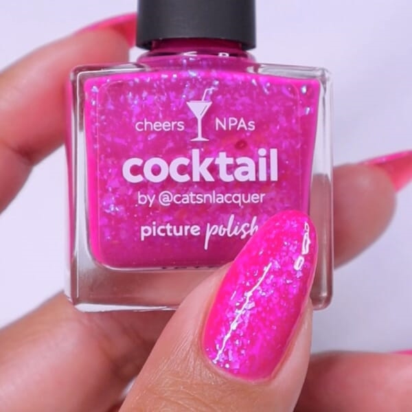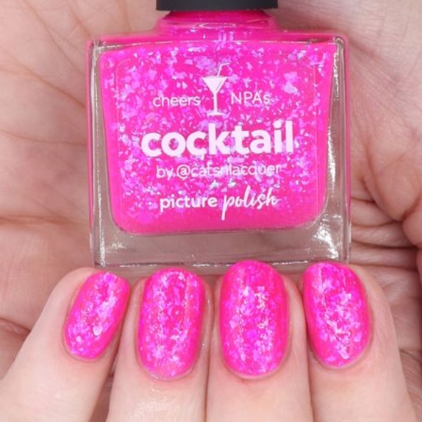 Cocktail er en neon-pink jelly neglelak med blågrønne iriserende flakies. Den semitransparente base giver dybde og glød, mens flakesene fanger lyset og skaber et levende, glitrende spil. Hver lakering bliver lidt forskellig – og det er præcis dét, der gør den så spændende.
