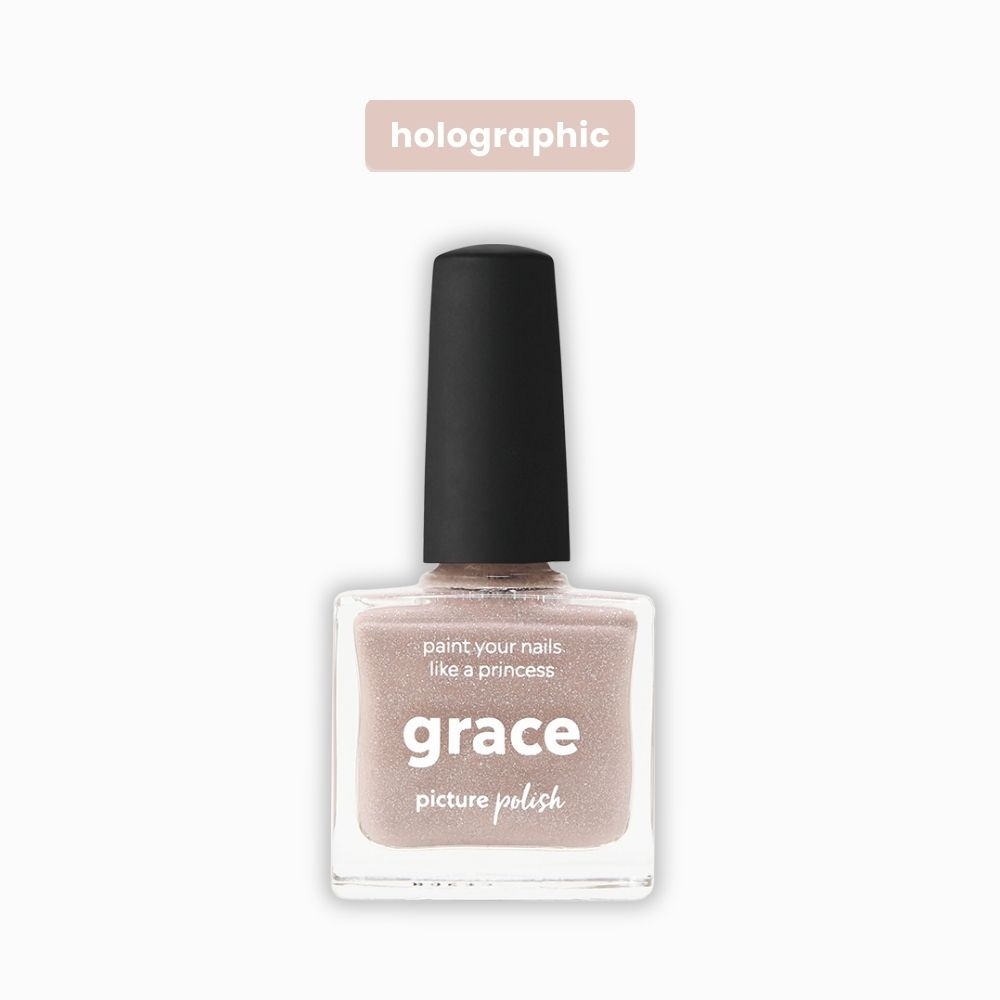 Grace fra Picture Polish er en nedtonet lyserød neglelak med fine scattered holografiske elementer, der funkler smukt i lyset. Den feminine nuance kombineret med holo-effekten giver et delikat, men iøjnefaldende udtryk. Ikke underligt, at Grace er en af de mest populære og bedst sælgende farver.