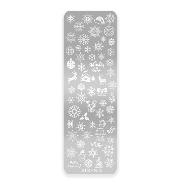 Fin jule stampingplade fyldt med snefnug, nissehuer, julehuse, rensdyr, julesokker og små julecitater. Den ultimative stampingplade, så du kan lave nogle søde julenegle.