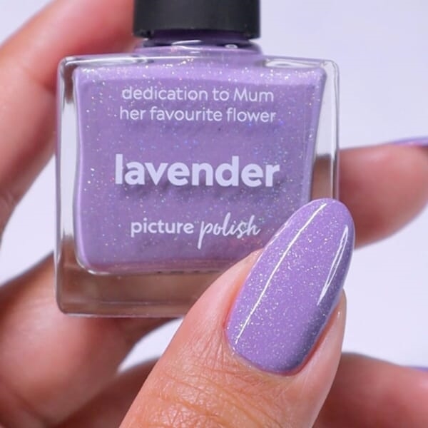 Lavender er en sart, lyse-lavendel nuance der balancerer mellem pastel og lidt kraftigere — ikke for kølig, men med en let kølig tone. Den giver et fredfyldt, perfekt til foråret eller som en rolig baggrund for negledesign og dekorationer.