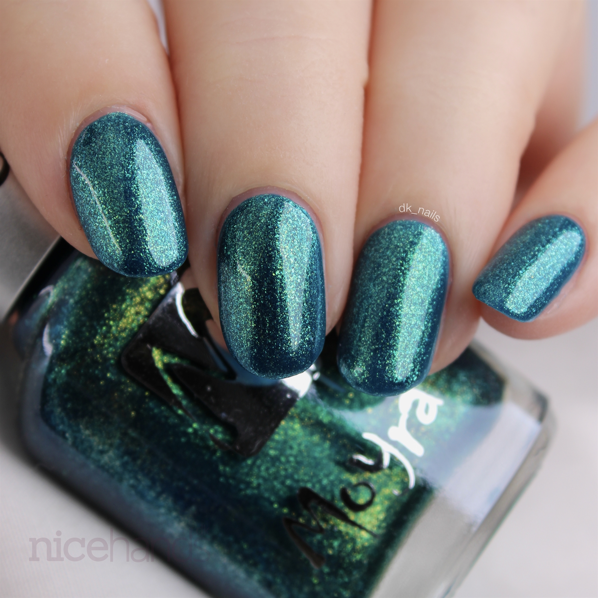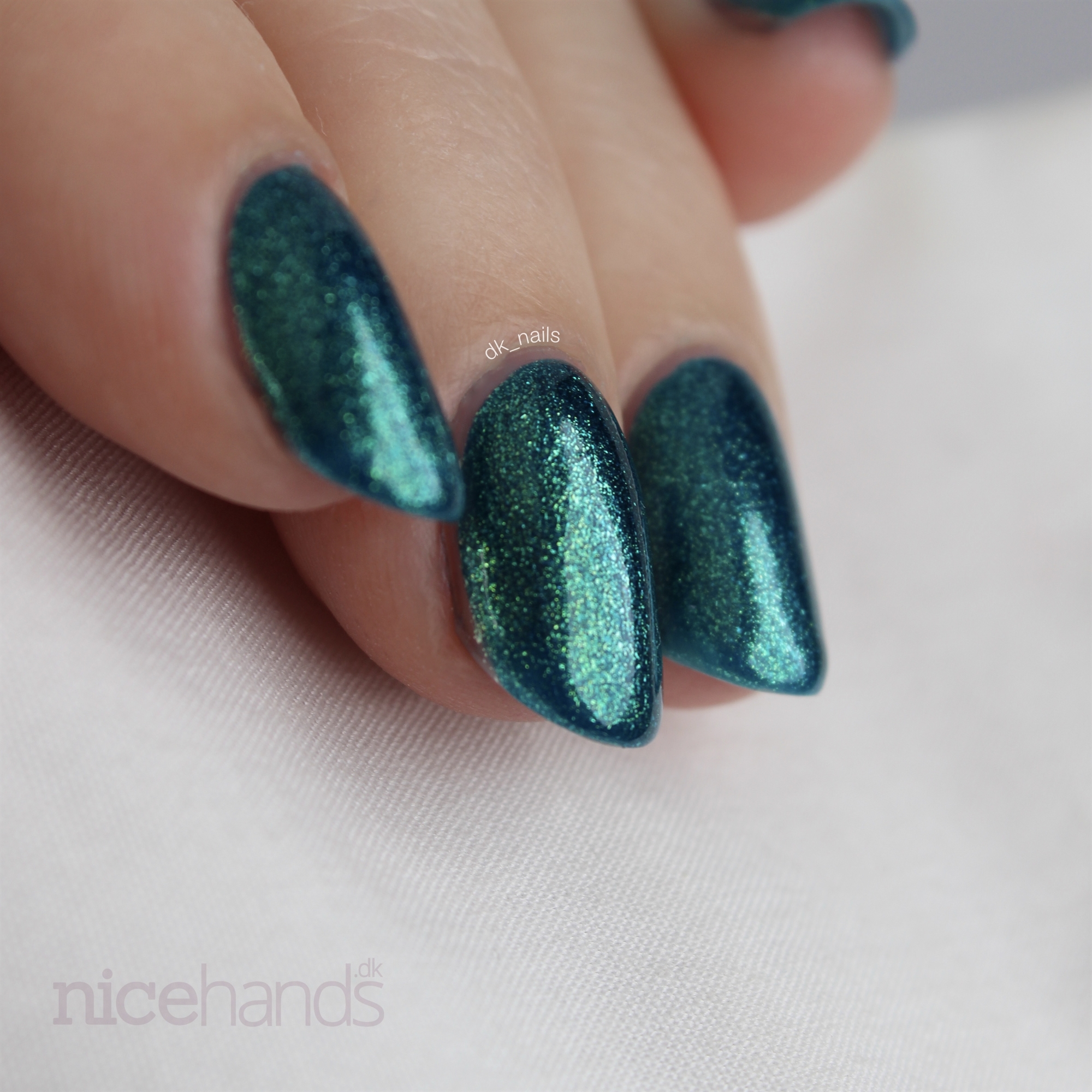 Leona er en blå havblå neglelak med en masse lækker shimmer i grønne nuancer. Neglelakken minder om en kamæleon neglelak, da den skifter farve i lysets skær - ligesom benzin. Selve grundbasen er en semi transparent, men kan blive heldækkende ved 3-4 lag. Leona er meget meget smuk!