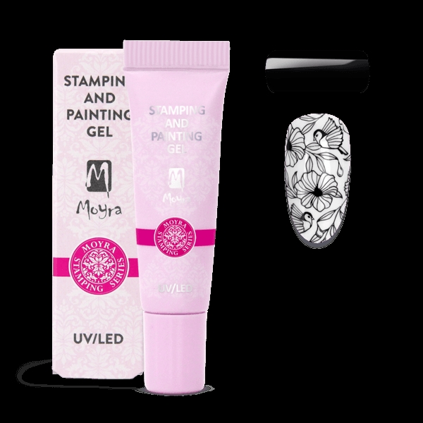 stamping med. Konsistensen på Stamping And Painting Gel'en gør det lettere at stampe og lettere få hele designet med op fra stampingpladen. Den høje pigmentering gør det til en leg at lave de mest detaljerede linjer og mønstre. Fordelen ved at bruge gel frem for stamping neglelak er at gel'en ikke tørrer før den rammer UV/LED lys. Du har derfor mere tid til at ændre på dit design og undgår tørretid efterfølgende.