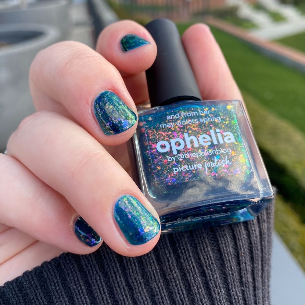 Ophelia fra Picture Polish er en unik dyb teal grøn neglelak, fuld af multi-farvede aurora flager med rødlige strejf, der giver et fortryllende farvespil og masser af dimension. Kombinationen af de mørke toner og de glitrende flakes skaber en dramatisk og elegant effekt, som fanger øjet i ethvert lys.