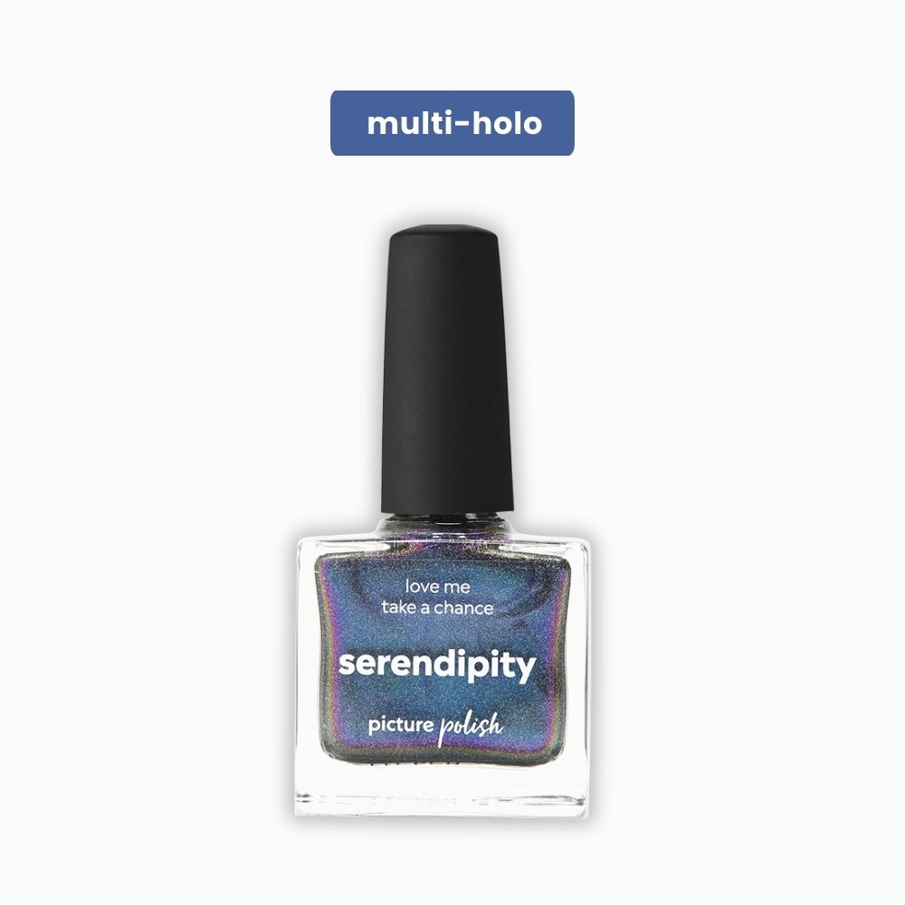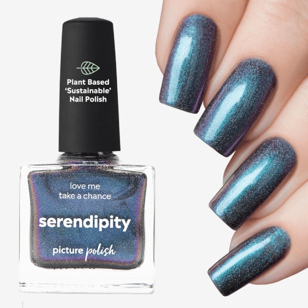 Serendipity fra Picture Polish er en spektakulær chrome-neglelak med holografisk effekt, der changerer smukt mellem grøn og orange. Den fede chrome-finish giver et levende farvespil, der minder om benzinens glimtende overflade, og den silkebløde konsistens gør lakken lækker at arbejde med.